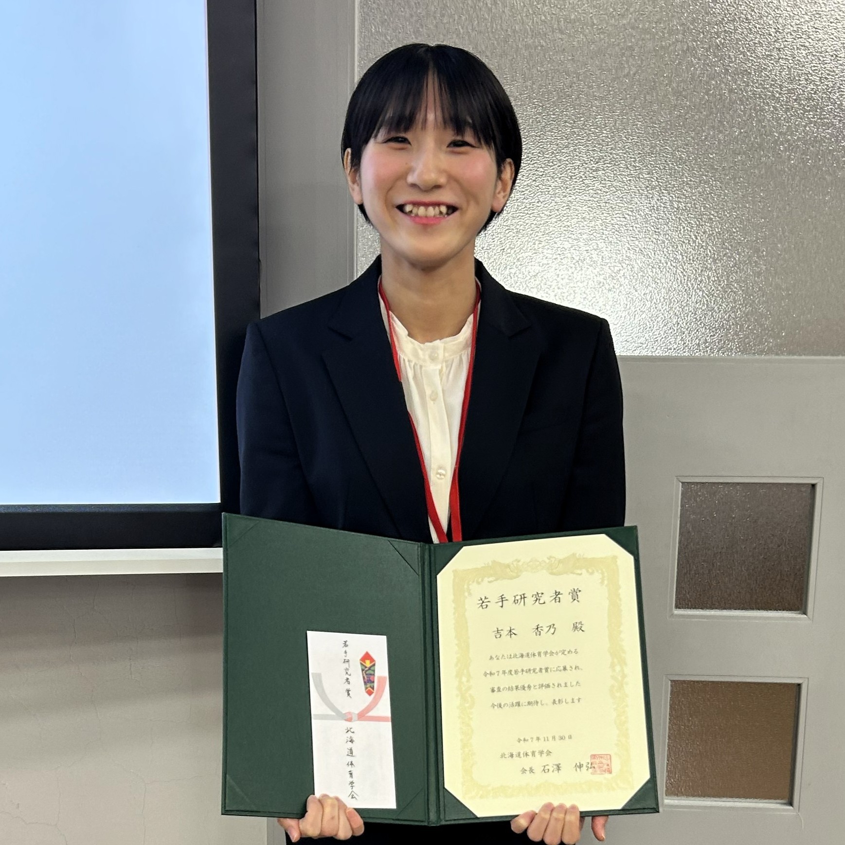 この度は若手研究者賞を賜り、大変光栄に存じます。本研究は2025年度北海道体育学会「研究助成」を受けて実施したものです。選考委員の先生方に心より御礼申し上げます。また、本成果は山口太一先生、柴田啓介先生をはじめとする共同演者の先生方のご指導、ならびに研究室の皆さまや被験者の皆さまの多大なるご協力によって得られたものです。深く感謝申し上げます。今回の受賞を今後の研究活動の新たな出発点と捉え、より意義のある研究を行えるよう研鑽を重ねてまいります。今後ともご指導ご鞭撻のほど、よろしくお願い申し上げます。